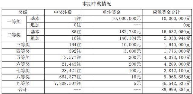 本期一等奖出自:本期一等奖出自:江西(基本1注)、河南(基本1注)、湖北(基本2注)。单注奖金1000万。